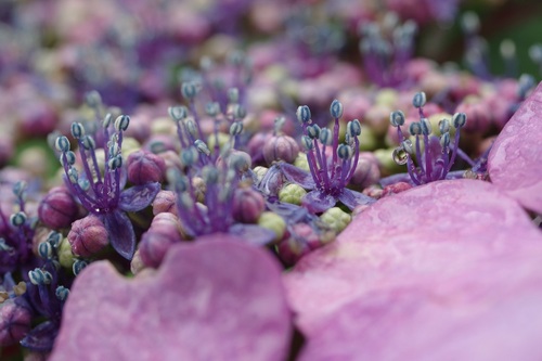 "アリスの不思議な国"に迷い込んだような色合い、露をまとうガクアジサイ