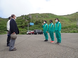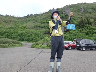 開会式では、松尾中学校の生徒さんが、「自分たちが誇りに感じている八幡平の自然景観を守るためしっかり駆除活動をしたい」と「宣誓」を行った後に、盛岡管理官事務所の塩野管理官から、タンポポは根を深く張っているため途中で切ってしまわないように慎重に作業する必要があること、他の高山植物にダメージを与えないように等注意事項の説明がありました。