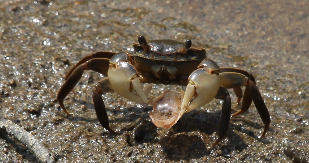 ヨシ原に巣穴を掘って生活しているアシハラガニです。甲羅の大きさは3.5㎝位の中型のカニ、貝殻をお皿のように持って右往左往してました。落ち着いたら、貝殻の付着物をハサミで取り口に運んでました。