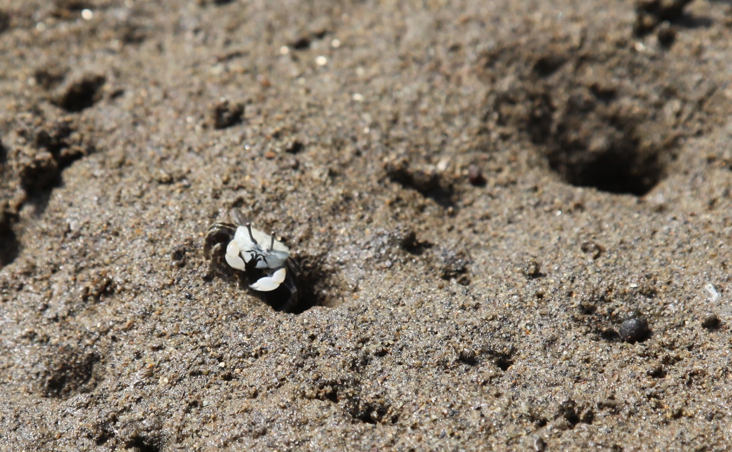小さな巣穴が沢山あるので近づいてみました。こちらでは、青白い小型のカニが巣穴の入り口で、ハサミを上下にふり、万歳、万歳、ダンスしています。