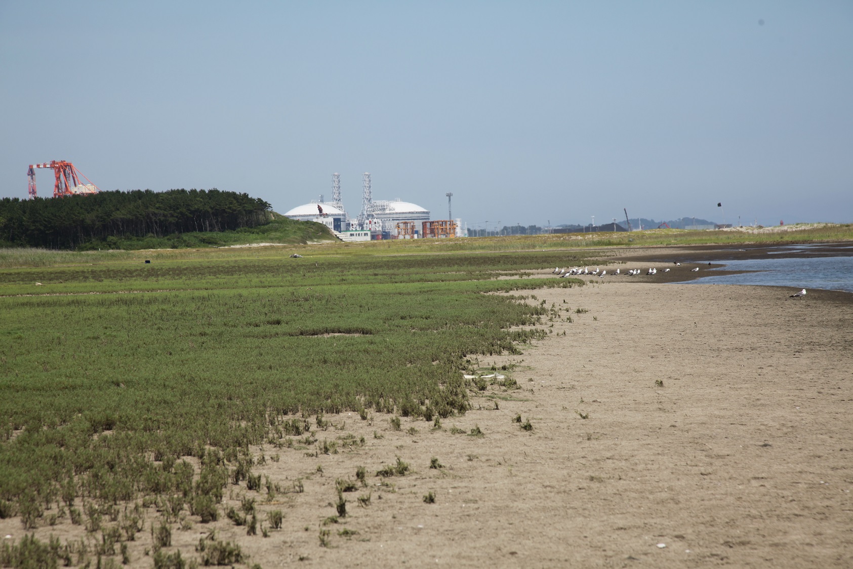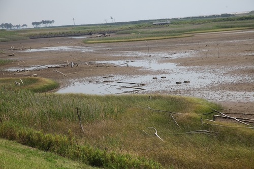 名取川河川堤防と県道仙台亘理自転車道に挟まれた干潟、通称「東谷地」と呼ばれているところでは、ヨシ、アイアシ、シオクグなどの植物が干潟の周囲に生育しています。こちらも静かに近づいてみましょう。