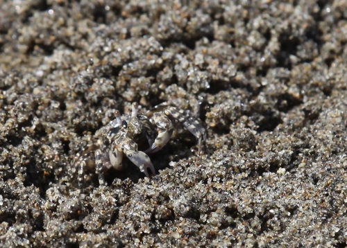 わかりますか?砂と一体化してますよ。ここですよ!ハサミを器用に動かして砂の中からエサを食べています。甲羅の大きさが1㎝位の小型のコメツキガニです。私たちが静かに歩いて近づいても、一歩、一歩の大きな振動に感じるので、しばらく、しゃがんで静かに待ちましょう。ひょこっ、ひょこっと顔を出し、巣穴から出たりひっこんだり、可愛い姿を観察できます。