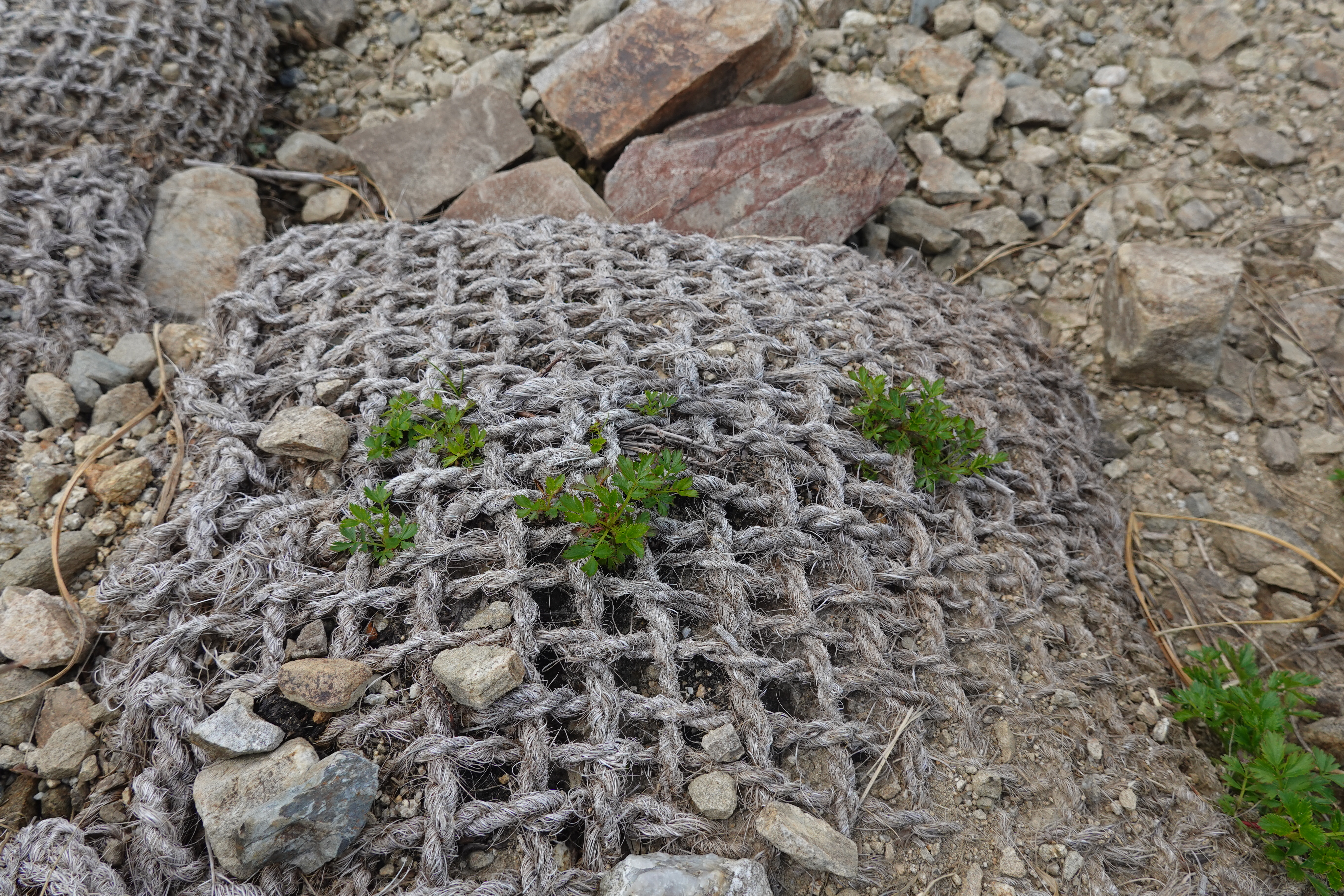 なんと、植物がヤシ土嚢から生えてきている場所がありました!これは植えたのではなく、外部から自然に種が入ってきた植物です。これこそ保全作業の成果です。しっかり定着して大きくなってほしいものです。