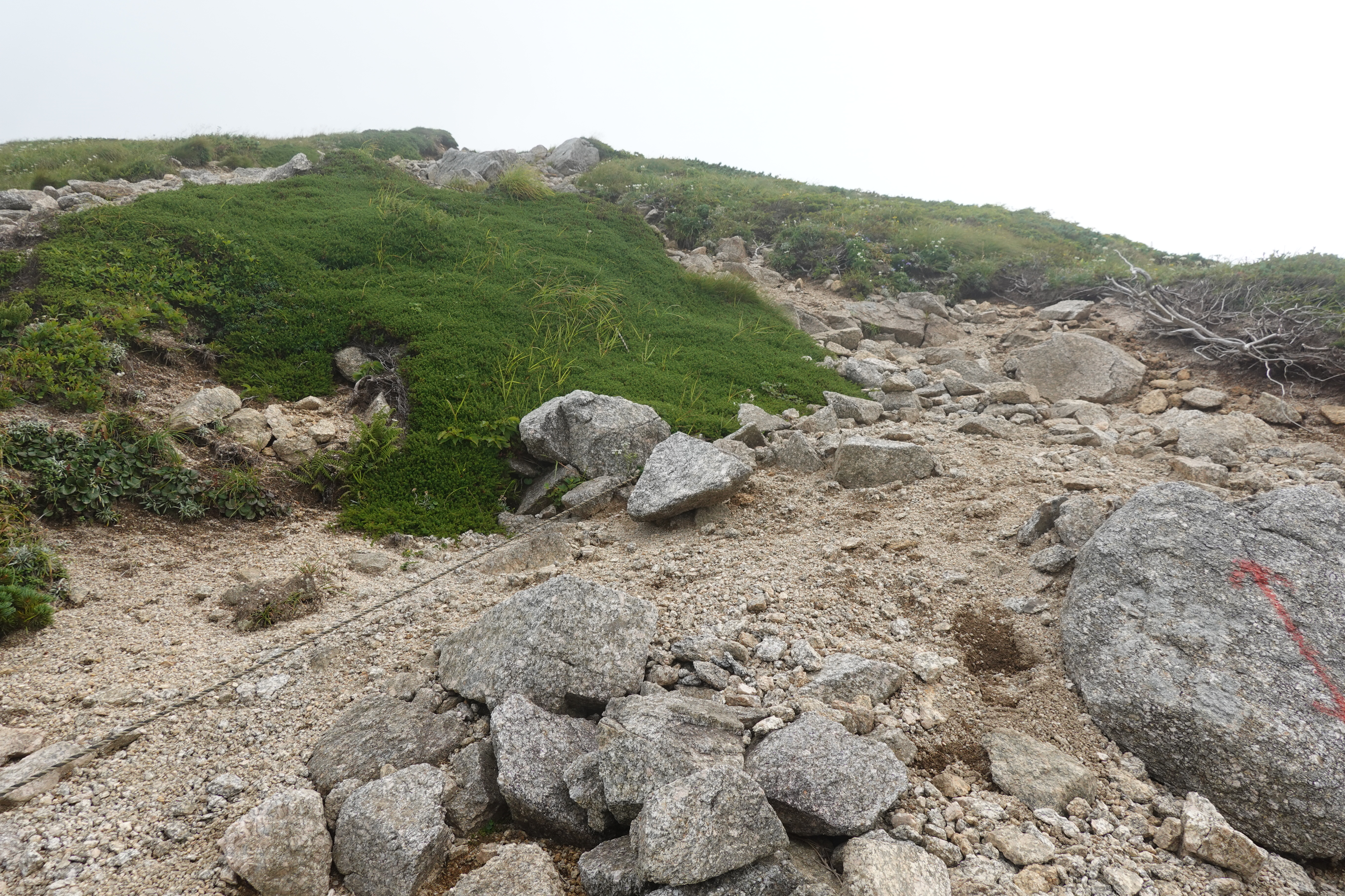 全体的にガレ場が続いています。植物もまばらにしか生えておらず、保全の重要性を感じました。登山道の崩壊は「水」「霜」「人」の三つが主に原因となることが多いといわれています。それぞれの原因に対応する保全方法を試行錯誤しながら作業を行っていきます。作業で用いるものは、主に荷揚げしていただいたヤシ繊維です。