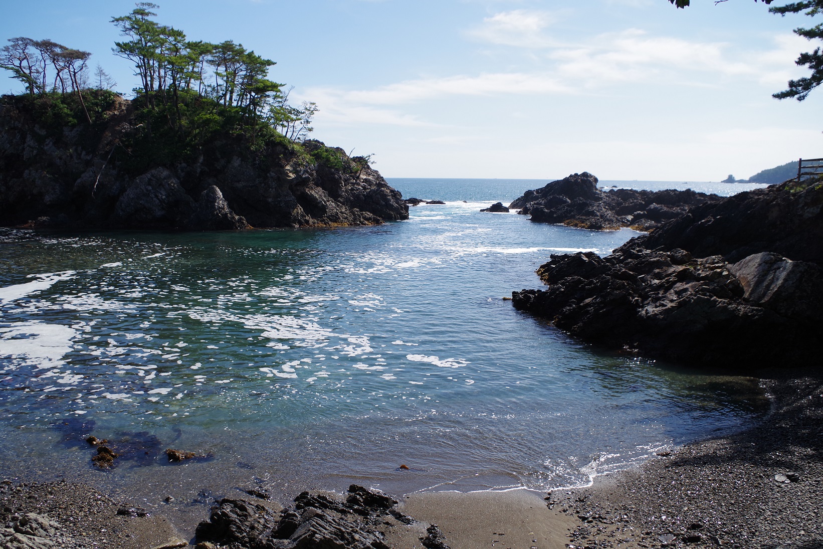 岩々に囲まれている静かな入り江には磯場が育ち、豊富な海藻や生きものたちが生息しているので、親子で磯の観察などオススメですよ。