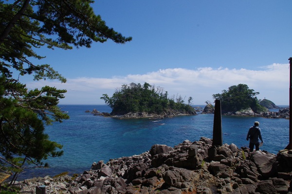 広田半島の南端にある岩礁の岬です。雄大な海原と点々と浮かぶ島々、荒波にもまれた巨石など絵画のような壮大な風景が広がります。先端から望める青松島と椿島は、古くからウミネコの繁殖地で、詩人土井晩翠が『千萬の鴎とぶなり白波の寄せて砕くるあらいその上』という詩を残しています。晩翠が感動したたくさんのウミネコたちが乱舞する情景は今でも見ることができます。青松島は県の名勝・天然記念物。椿島は国の天然記念物に指定されています。(上の写真右上奥の小さな灯台が建っている丸い島が椿島、その手前の木が茂った2つの島とまわりの岩礁群をあわせて青松島とされています。)