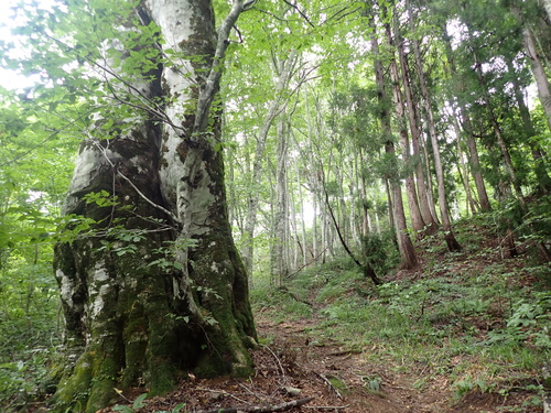 80台収容可能な駐車場を備えた広々した野営場を出発し、10分ほど歩いて橋を渡った所に登山口があります。飯豊山は古い山岳信仰の山、修験道の山です。登山口には、ご神木である杉の巨木が並び、その傍らに小さな祠があります。ここが長い急登が続く「長坂」の起点。登り始めるとすぐに、ブナやミズナラなどの巨木の森の中に入っていきます