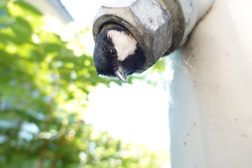 澤野保護官撮影の写真です。この鳥さんは、事務所のパイプ内に家をかりて住んでいるようです。自然に囲まれた土地ならではの光景ですね。癒やされました。