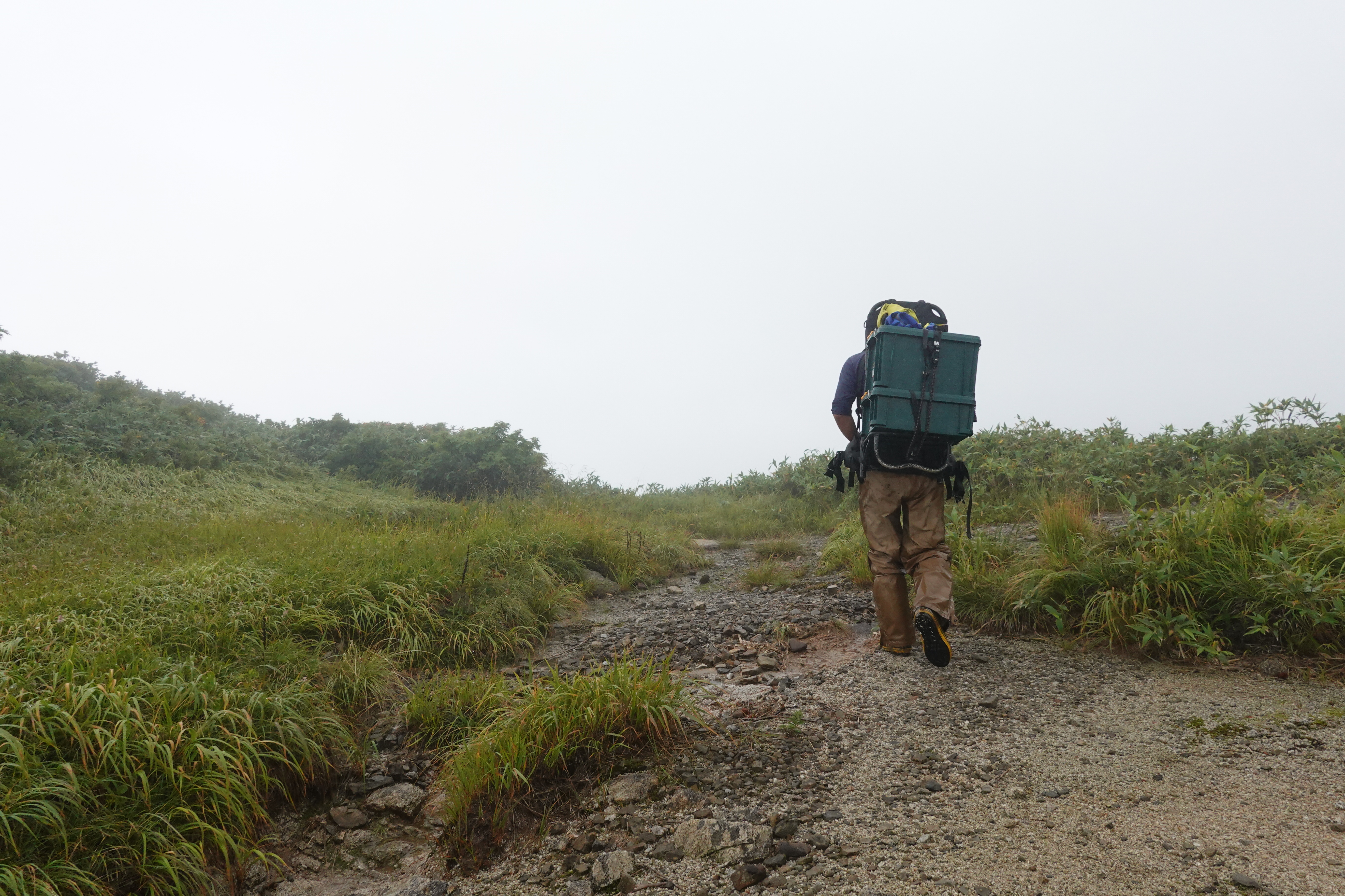 山脈を形成している岩盤の性質の影響により崩れやすい登山道になっています。人が通ることで踏み固められ、その後雨が降ると踏み固められた道を勢いよく水が流れます。そしてスピードの速い水の流れにより登山道が削られていきます。削られた道は他の場所よりも歩きやすいのでより多くの登山者がそこを通り、また踏み固められ・・・の悪循環が発生し登山道は荒廃していくのです。