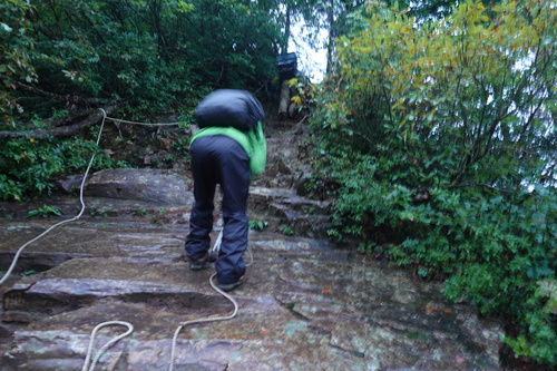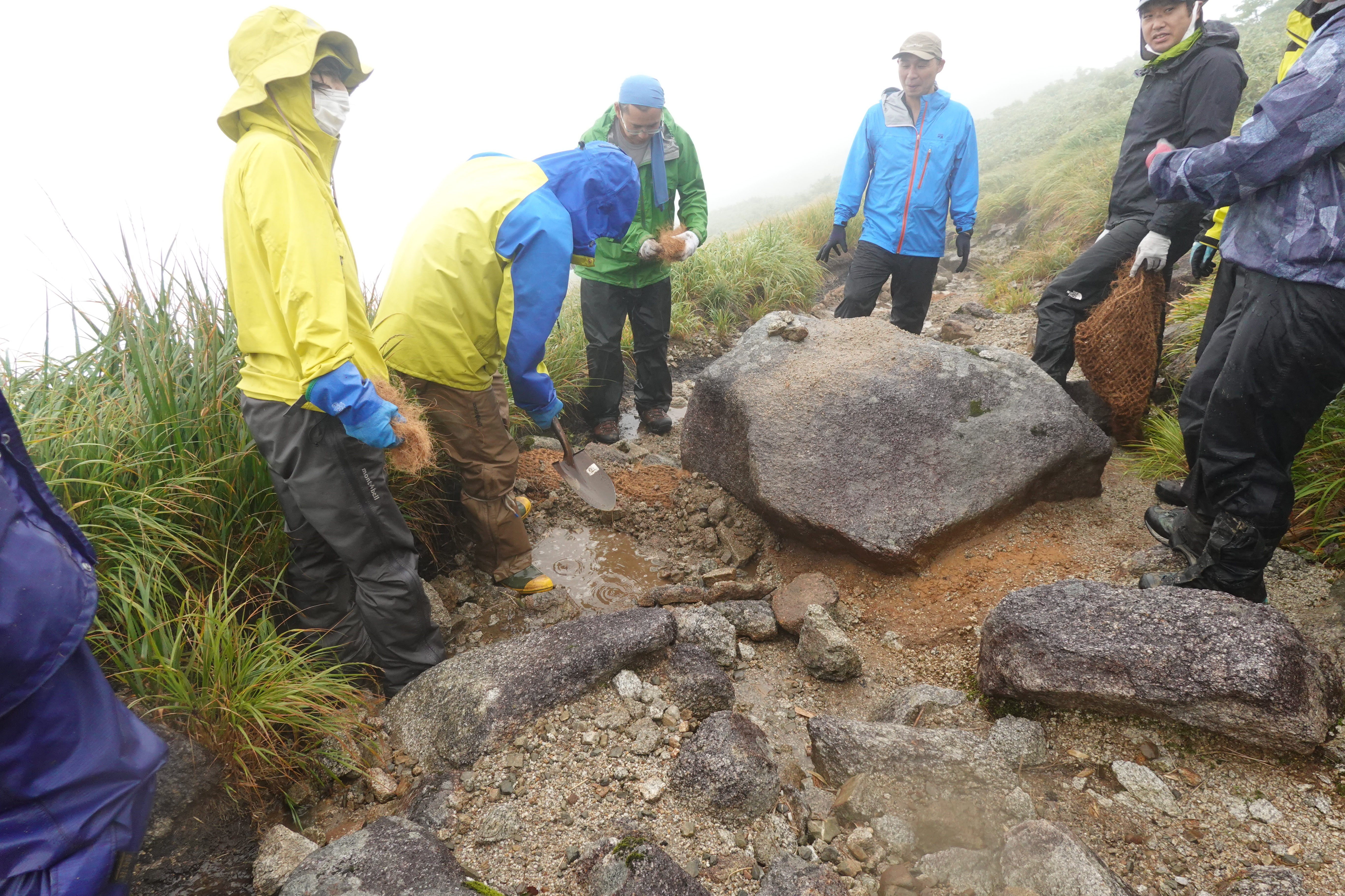 そう、この日は雨・・・。でも悪いことばかりではありません。登山道を削っていく水の流れが実際に見えるので作業がしやすいのです。先ほど作ったヤシ製土嚢の階段に水がたまっている様子を観察することができました。