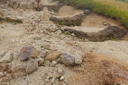 梶川尾根の上部はこのような白い色の登山道であり、これがとてももろく崩れやすいのです。今回の作業は、ヤシ製の土嚢を使って土砂をためることです。流れてきた水の中に含まれている土砂を、ヤシ製の土嚢で止めます。そうすることで、削られて窪んでしまった登山道に少しずつ土砂がたまっていきます。