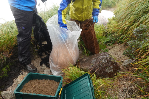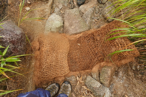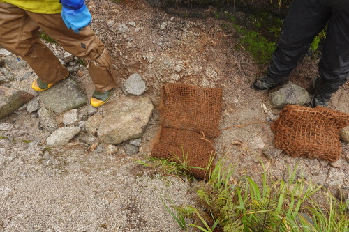 登山中にヤシ製土嚢の様なものを見かけましたら、このような活動が行われているということを思い出していただけますと幸いです。
