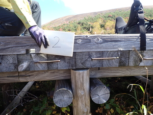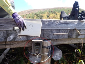 この日の作業は、浄土平湿原に設置した監視カメラの撤収です。以前、浄土平湿原では7~9月頃を中心に、多数掘返し跡が確認され、中には保全対象種の生育場所が集中的に掘り返される事例もあり、盗掘の被害が疑われたため、数年前より、湿原内を周遊する木道等に自動撮影カメラを設置しています。