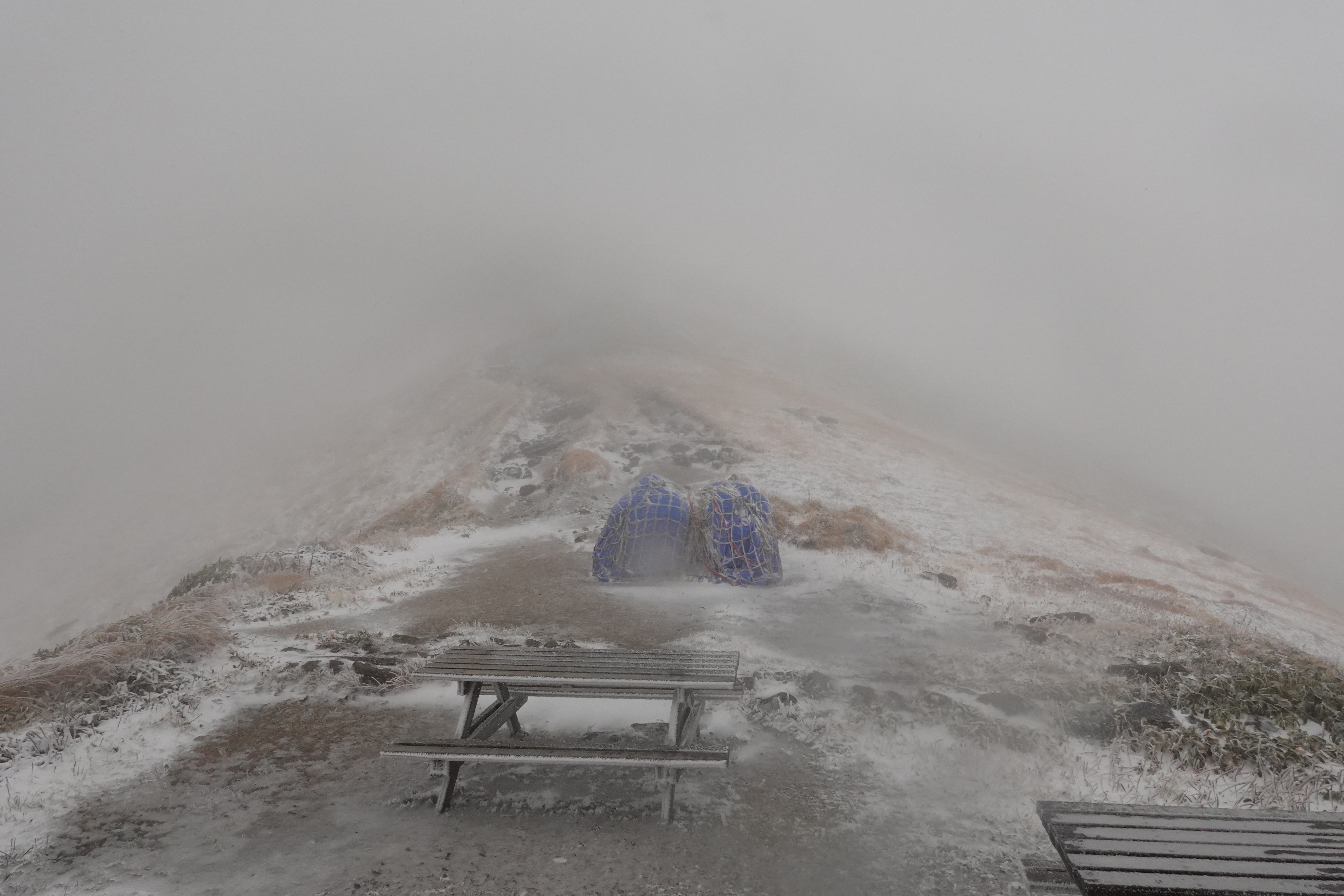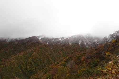 もう少しで以東岳避難小屋に着く、、、と思った矢先、みぞれはなんと雪に変わりました。10月中旬の朝日連峰はもう雪が降るのです。
