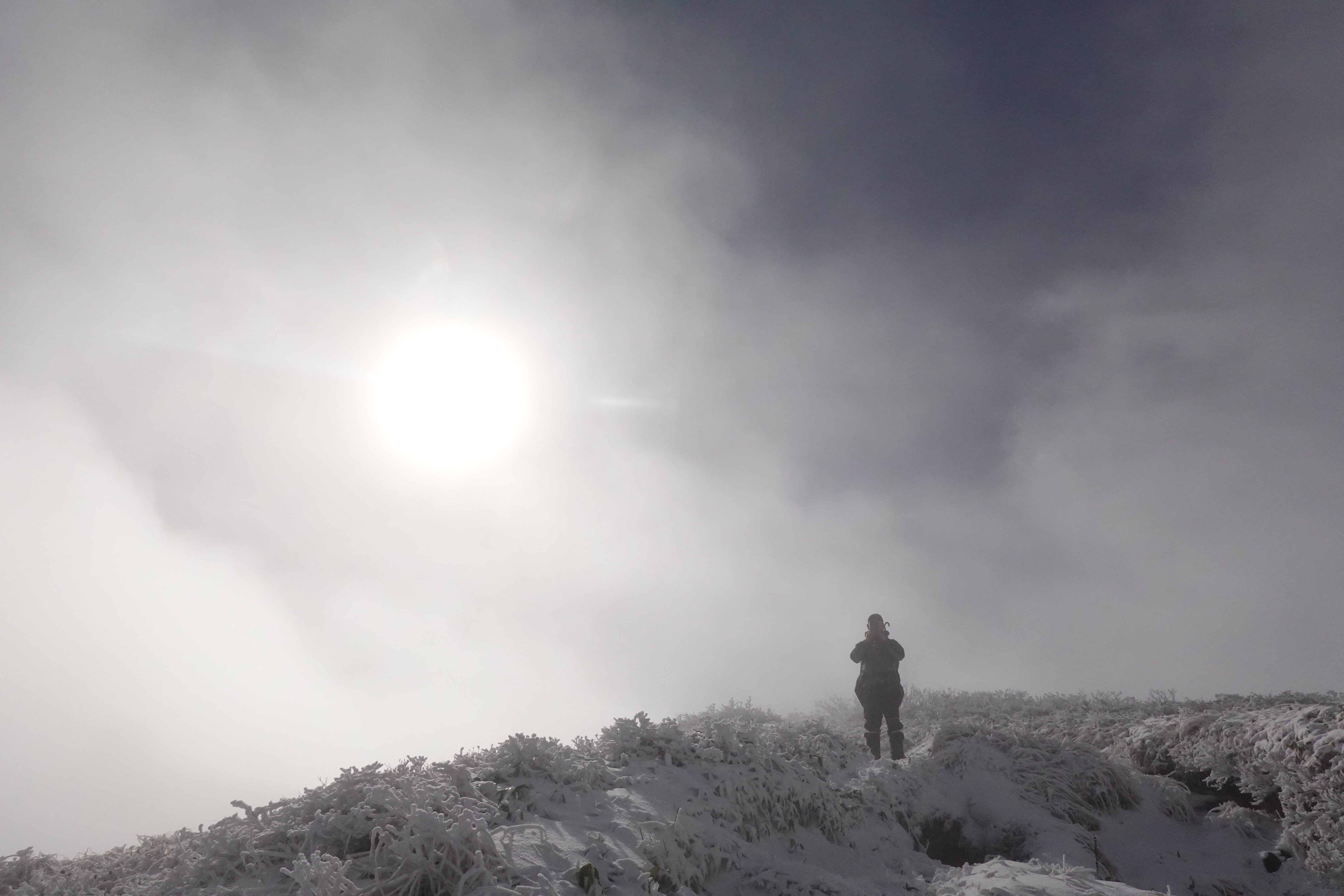 ほんの一瞬の晴れ間をとらえました。たったの数時間でこの雪景色です。朝日連峰の冬は甘く見てはいけませんね。登山の際はしっかり防寒グッツを持ってきてくださいね。