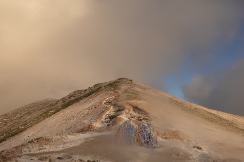 雪+暴風の大荒れの天気になってしまいました。これでは作業はできません。以東岳避難小屋に転がり込み、暖かくして天候が回復するのを待ちます。避難小屋の存在というのは本当にありがたいです。