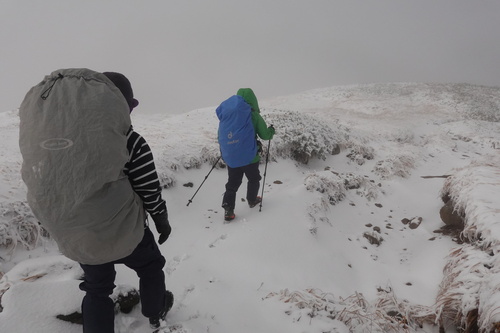 二日目の朝はさらに気温がぐっと下がり、朝から大雨でした。徒渉地点もなかなかハード。カメラは出せませんでした。急登を登る中、雨の質が変わったと思ったら、みぞれでした。