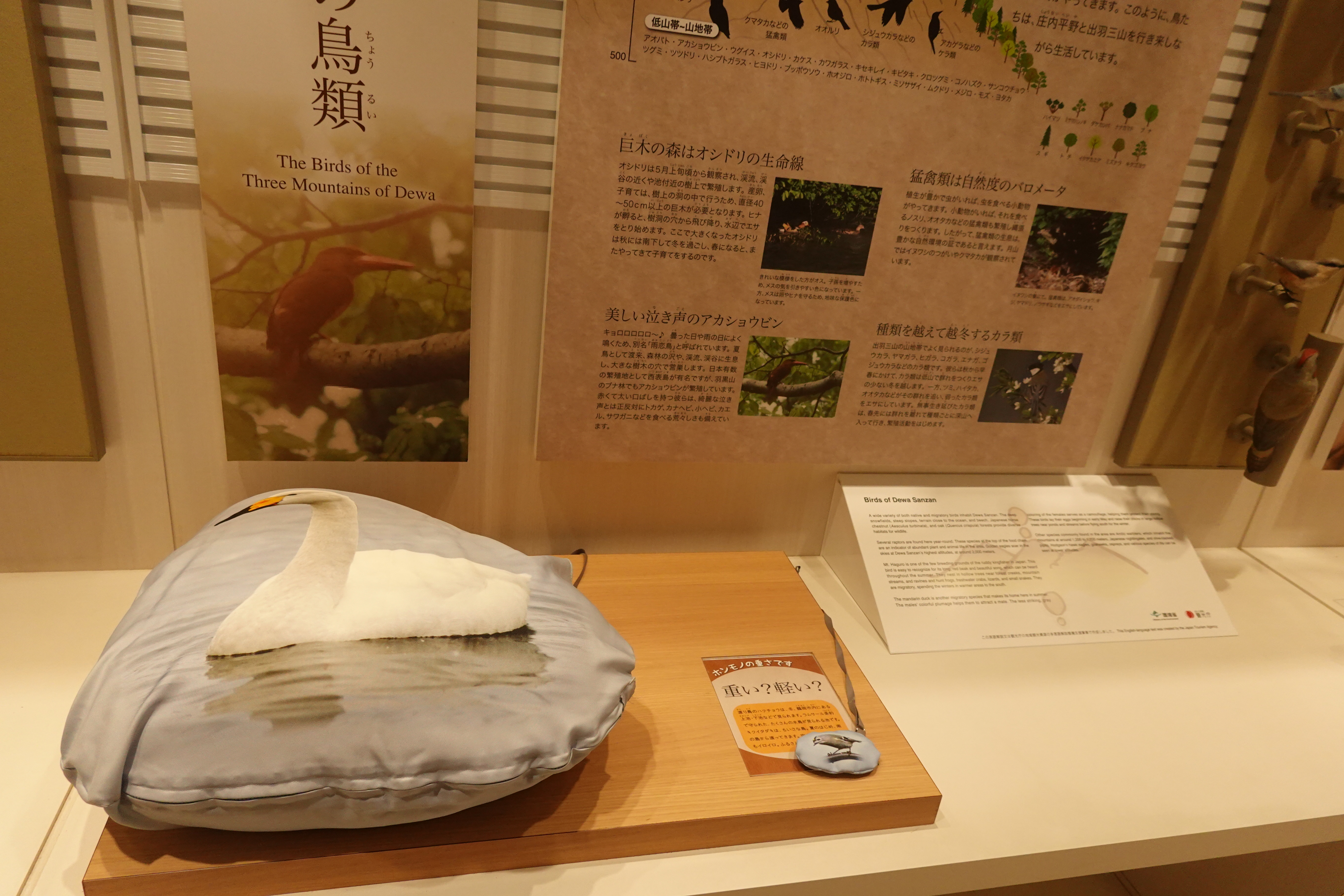 白鳥の重さ、知っていますか?思っているよりも重いんです。そんなことを体験できるコーナーもあります。