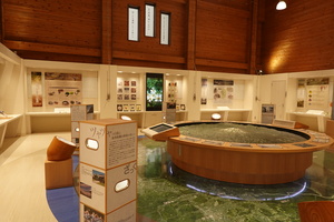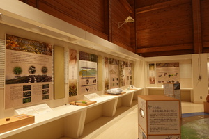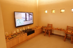 奥には広い展示室が!仕掛けが沢山ついている立体マップがあり、出羽三山の歴史、動植物、文化、地質などが紹介されています。