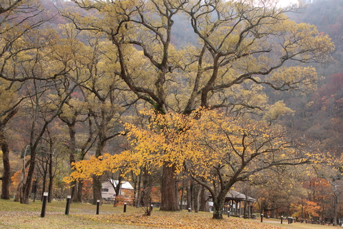 冷たい雨が降ってきました。休屋へ急ぎます。休屋の玄関口にある大きなイチョウの樹は