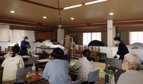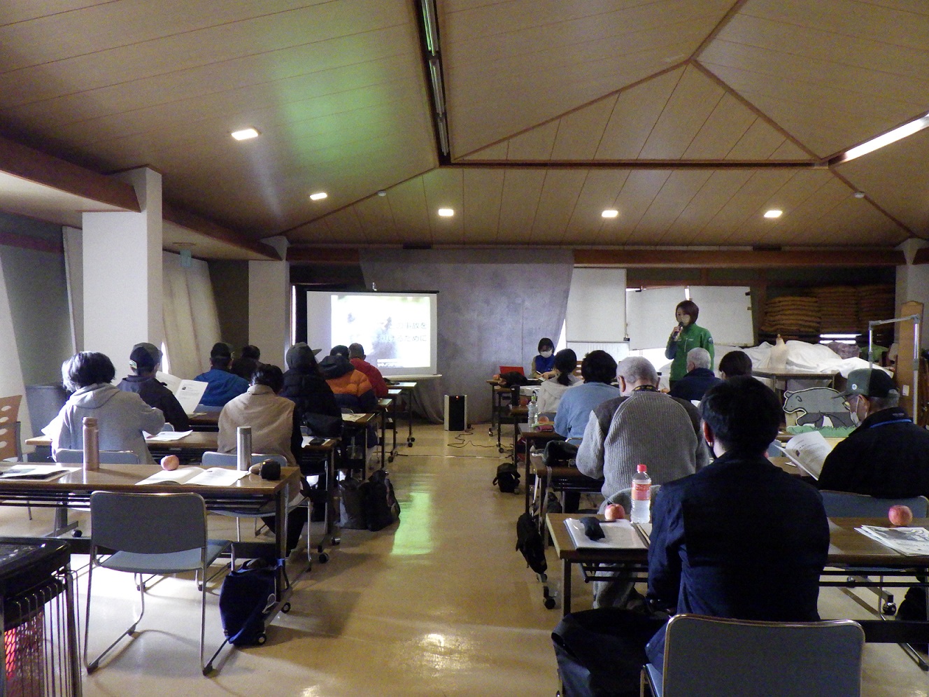 1日目は秋田県自然保護課よりクマ被害対策専門職員の近藤さんをお招きし、クマの生態から山での活動中に事故に遭わないようにするための基礎的なことの他、集落への出没の対策などお話しいただきました。日頃からクマ鈴を付け、山では単独行動はしないなど慎重に活動しているほど私たちの身近にいるクマ。クマ対策については一般的に言われていることをなんとなく実行していましたが、専門家の話を聞き、確信を持って山行に挑める気持ちになれました。恐れ備えることは大切なことですが、好物や遭遇したときの対処法、そして臆病者の可愛らしい一面を持つクマを知ることができ、とても有意義な講義でした。