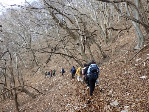 2日目は、前日の講義を頭に置いて、クマが生息する山中を実際に踏査です。舞台は地名"熊ノ入"からスタートする綾里峠(りょうりとうげ)、みちのく潮風トレイルのルートです。この時期は落葉し、とても見通しのいいトレイルなのでクマに遭遇することは難しいですが、痕跡があるか注意して歩いてみました。