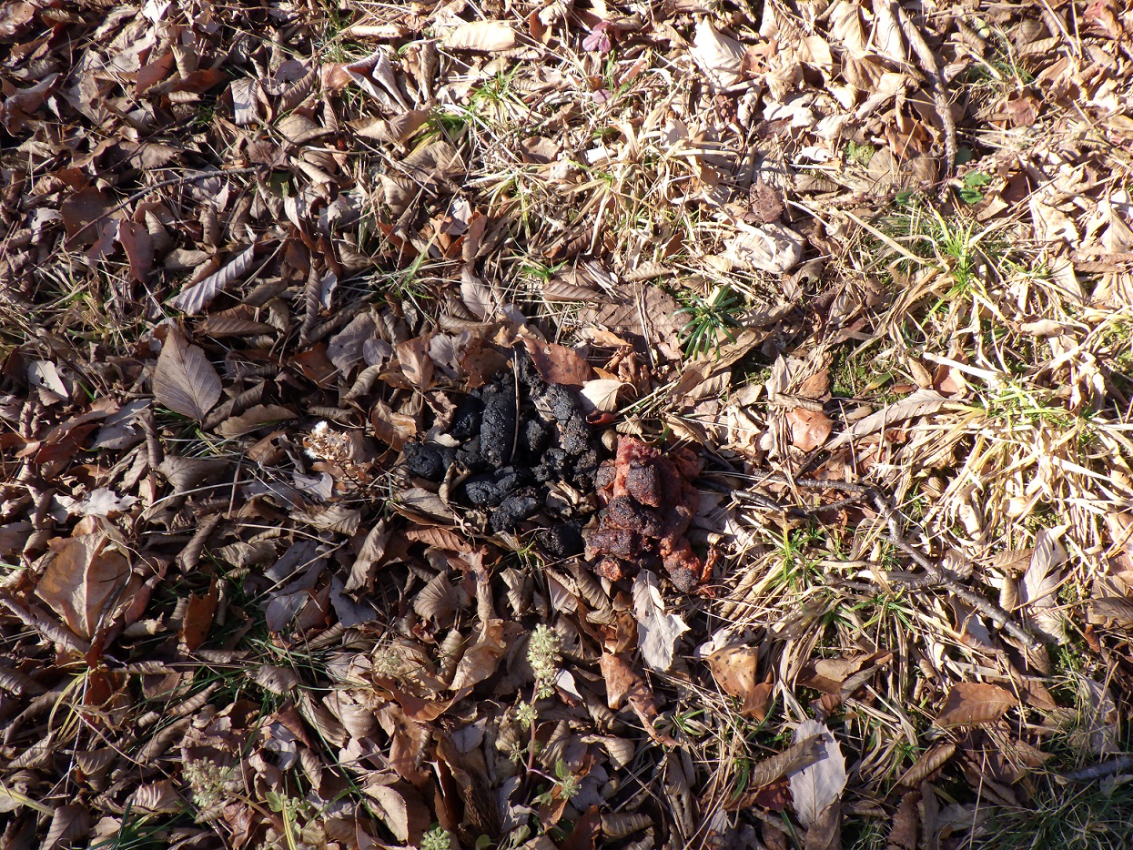 〈獣の糞発見!数回分をためていて、太さからも「タヌキ」を導き出しました。〉