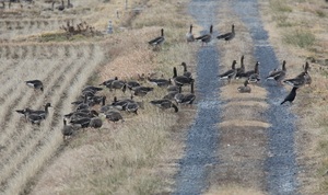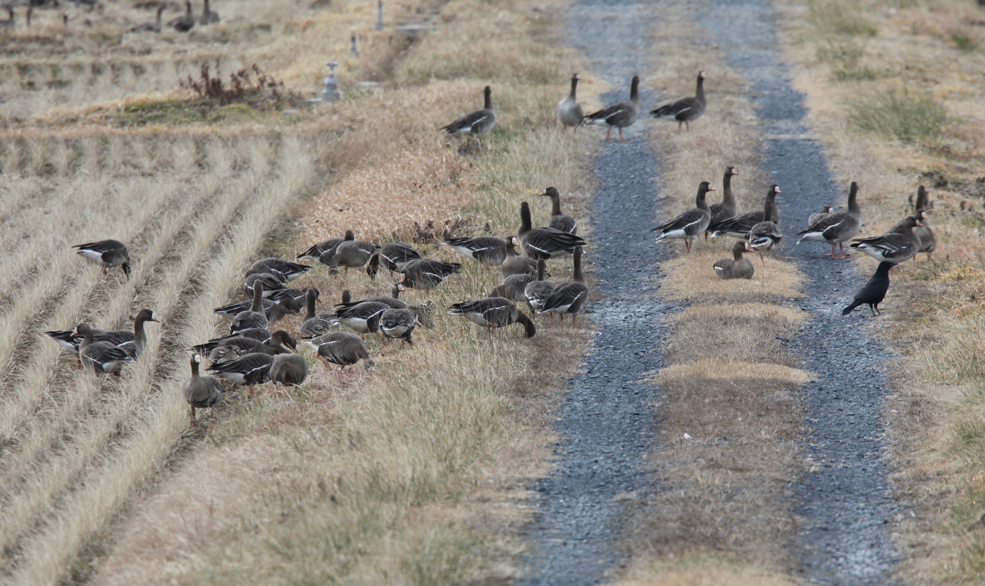 国指定伊豆沼鳥獣保護区周辺では、北帰行の準備で体力をつけるために、マガンの家族が田んぼや畔の雑草をせっせと食事している様子が観察できます。