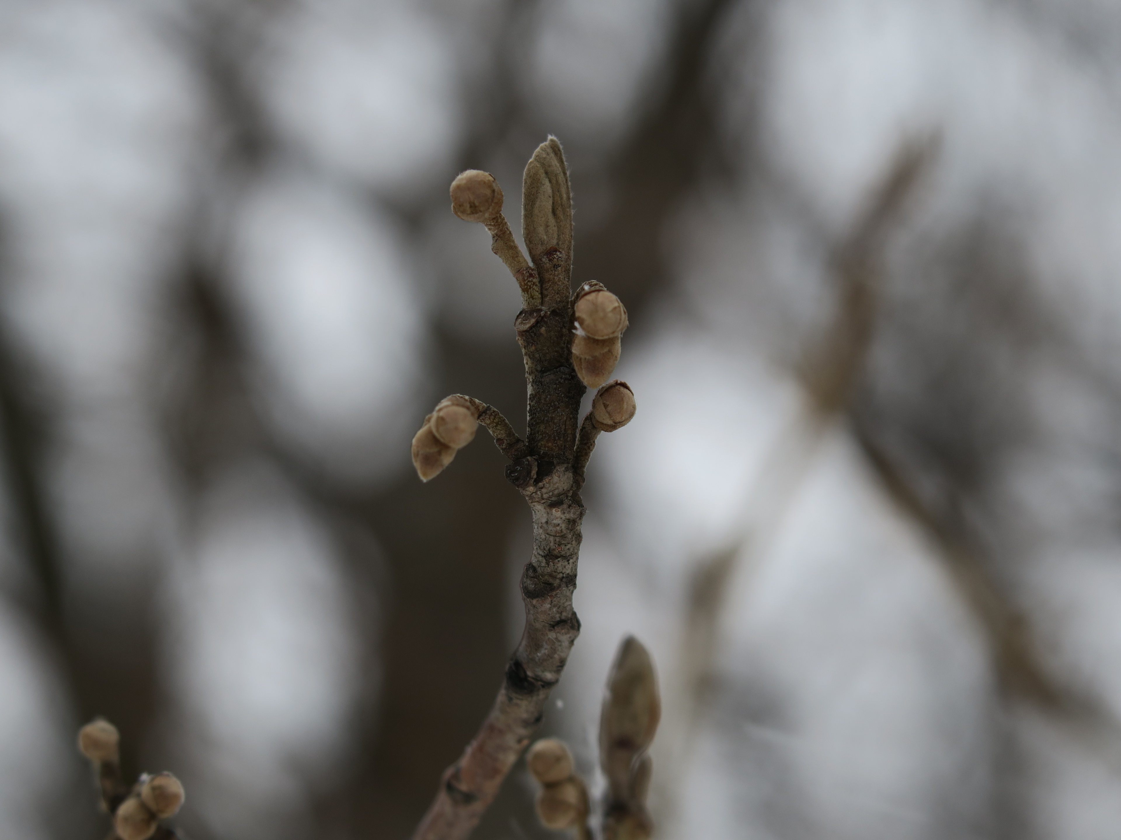 マンサクは吹雪の中まだまだ口を固く閉ざしています。