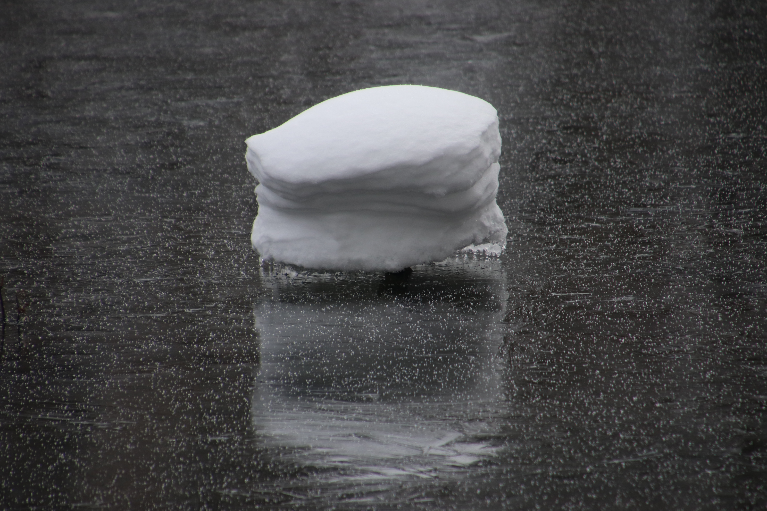 氷の上にうっすらと雪が積もっています。