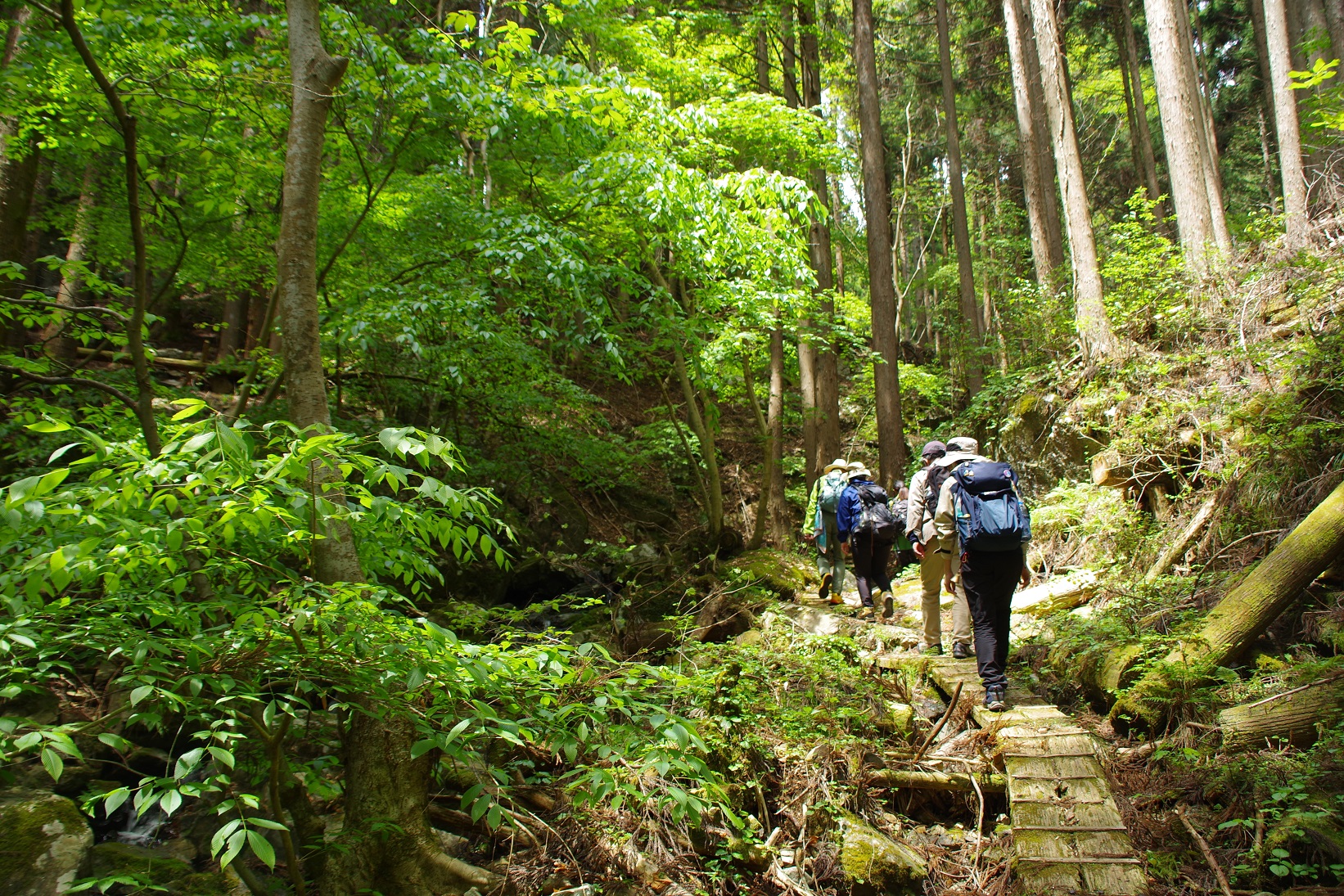 僧たちの修行の場であったことを伝える"行者の道"で登頂を目指し、南三陸町側の樋の口からスタートです。沢沿いに苔むす岩々や木道、吊り橋などを進むとかつての修行場の厳かな雰囲気を感じます。