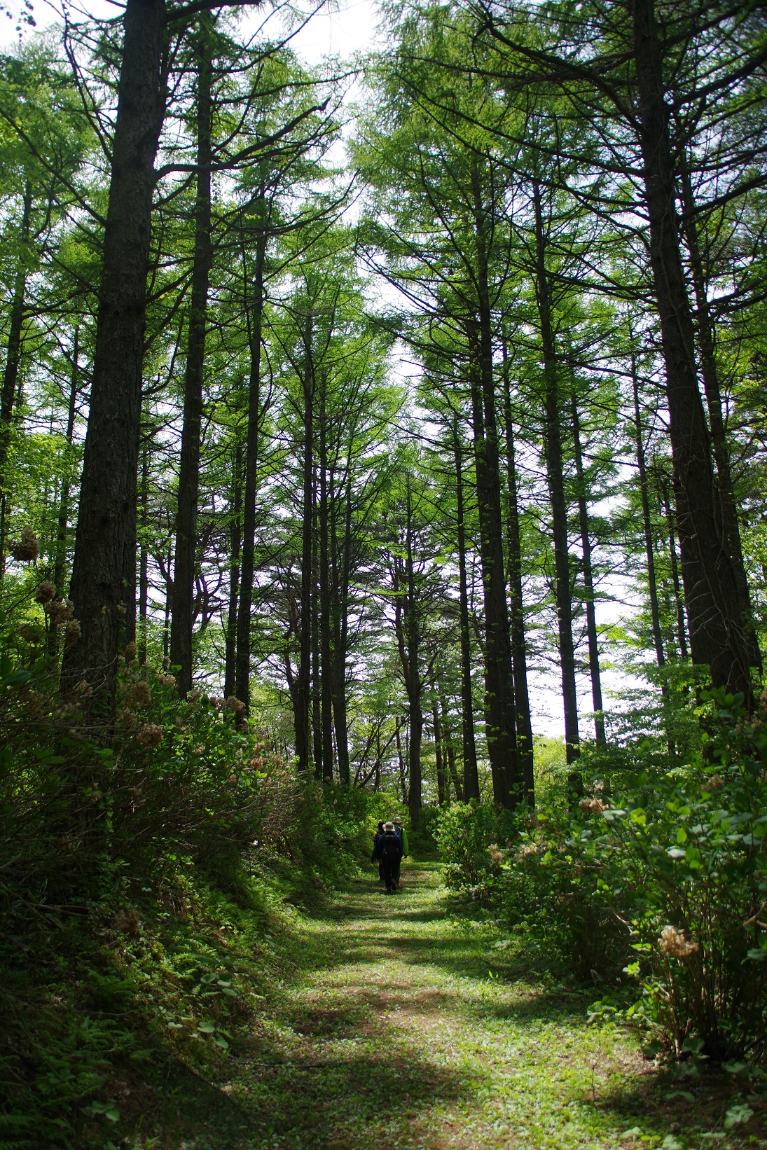 厳粛な雰囲気の杉林のしっとりとした道を過ぎると、歩道沿いをアジサイが縁取る明るいカラマツ林のエリア、活き活きとしたケヤキの樹林帯など様々な表情を楽しめます。植生も豊かなので小さな生き物との出会いもまた楽しく、季節を変えて訪れたくなる散策路です。車でらくらく登頂のできる田束山ですが、行者の道を徒歩で登るのがオススメです。