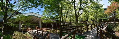 白神の森をイメージして造園された木立の中を進むと、センターの入り口が現れます。