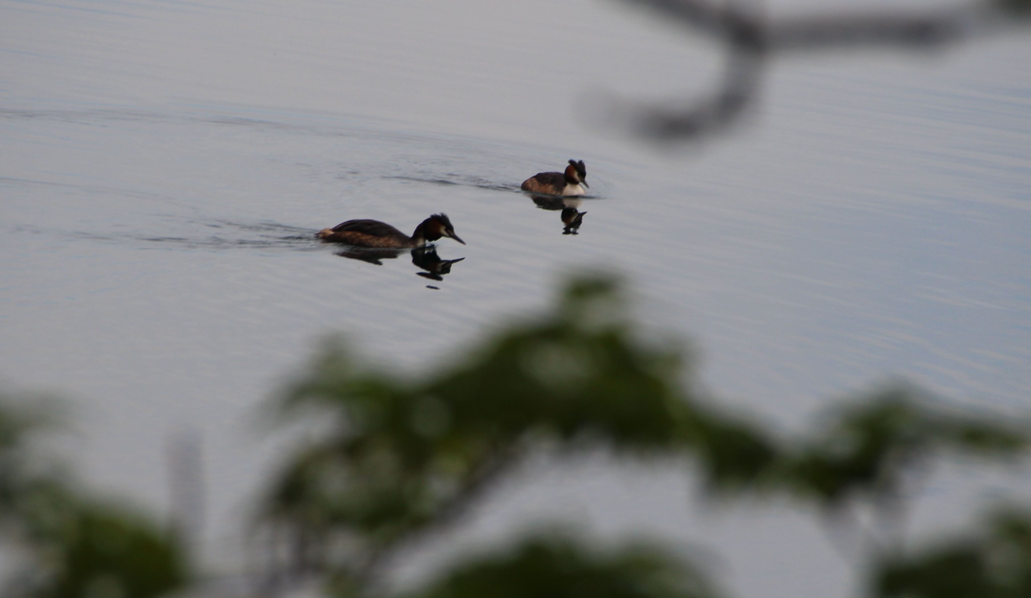 遠くにぼんやりと写っているのは、どうやらカンムリカイツブリです。