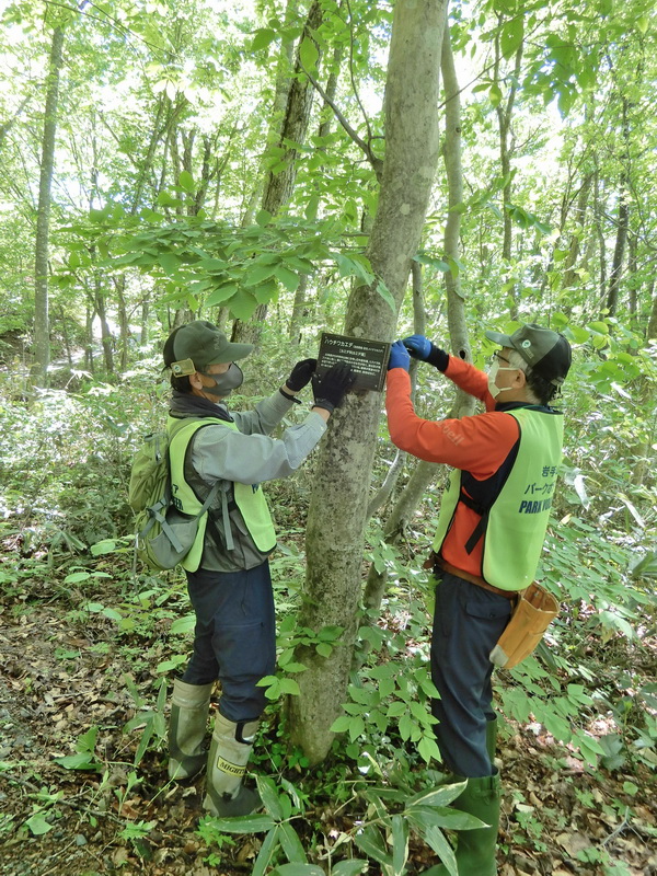 先日、網張りビジターセンターの前に広がる網張の森の散策路へ樹名板の取り付け作業を行いました。