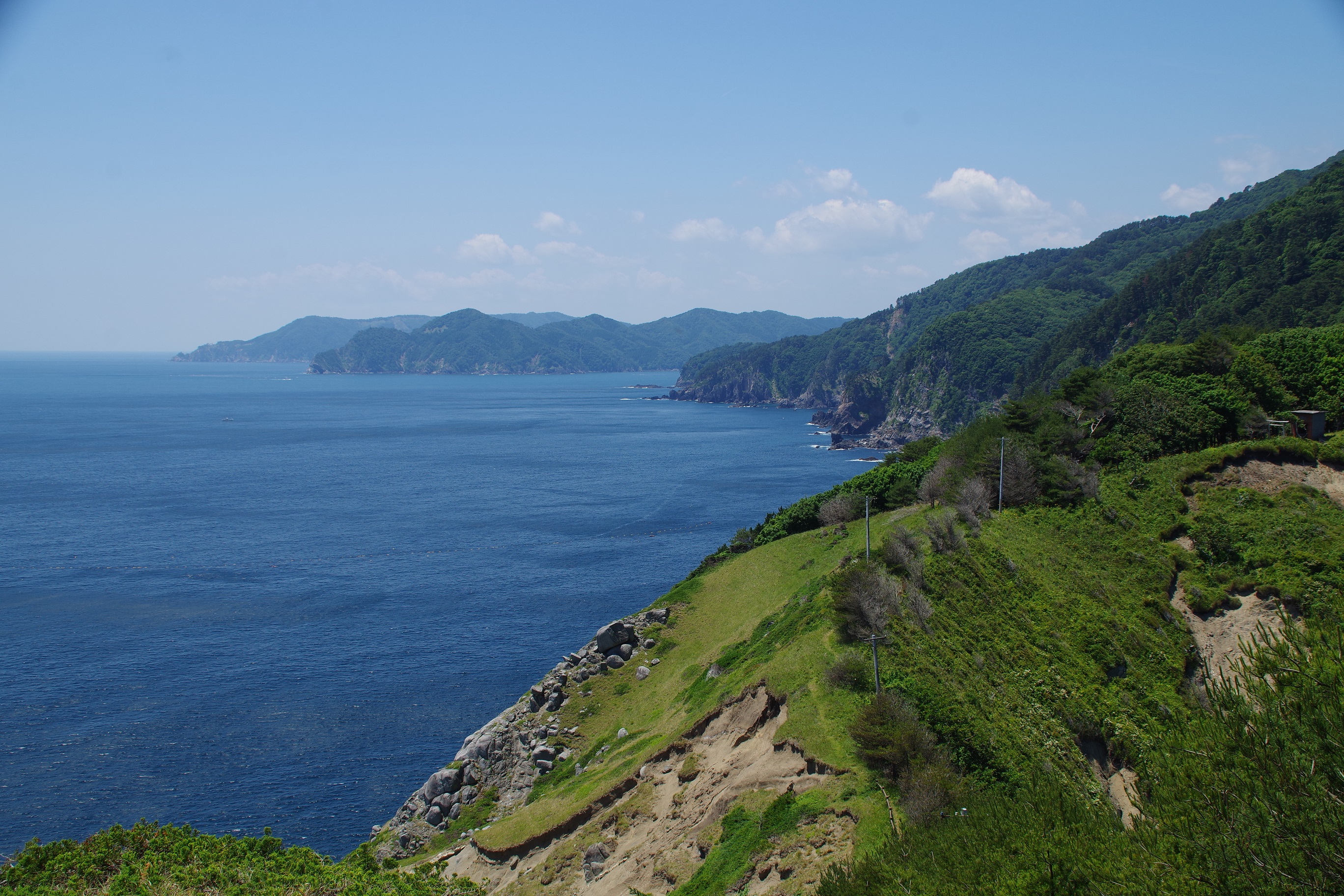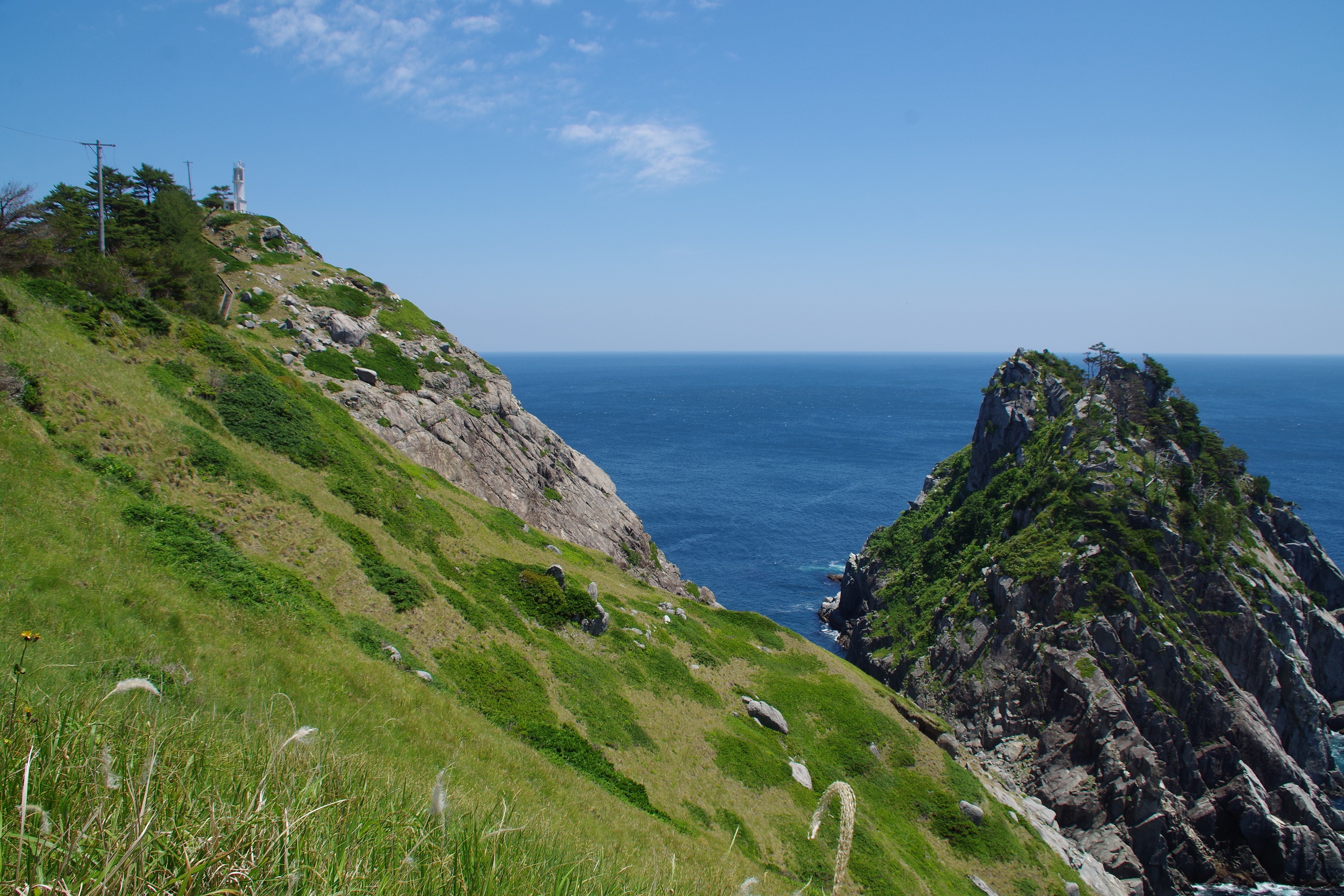先端を後にし、振り返った画です。左側てっぺんに灯台が鎮座しているのがわかりますでしょうか。現代の灯台はクリーンエネルギー化が進み、太陽光や波力などで生まれた電力を使っているものが多いそうですが、首崎灯台の手前に電柱が2本見えますね。これはかつて送電線を渡していた電柱で、首崎灯台もすでに送電は受けていないので全く使われていないコンクリートの柱がただ立っている、という状態です。