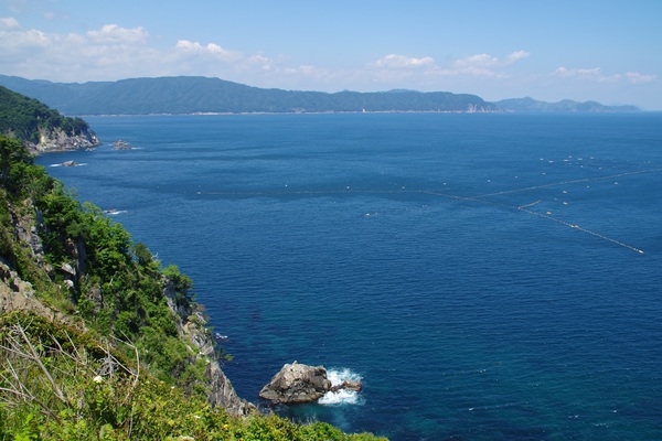 北側は吉浜湾(よしはまわん)になります。海上に線のようなものが見えますが、定置網のブイが並んでそう見えます。海中には魚を迷い込ませる迷路が張りめぐらされているんですよ。100メートルもの高さから見るとさながら地上絵ならぬ海上絵ですね。