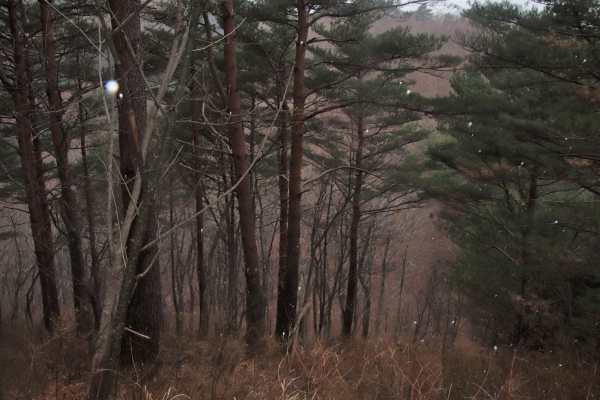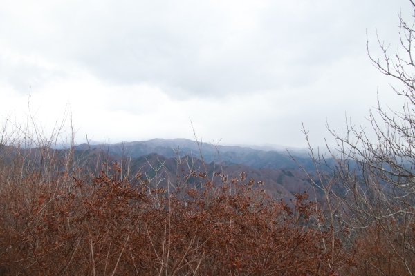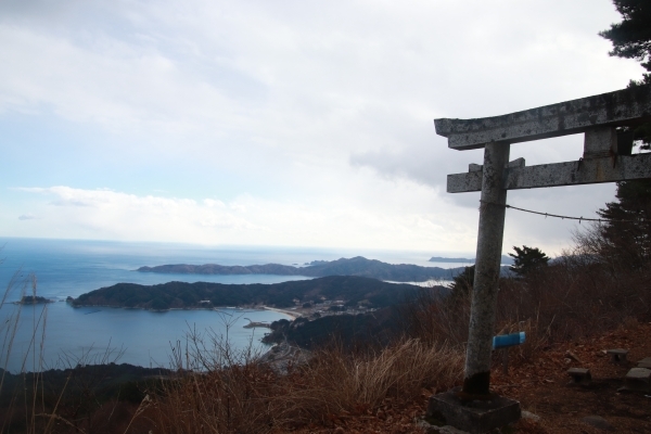 途中、九州からみちのく潮風トレイルを歩きにお越しの2人組に出会い、少しばかりお話し。そんな嬉しい一期一会や休憩を挟みつつ、2時間弱で頂上に到着。標識や鎖の点検も完了して頂上からの眺めを堪能していると、周囲で雪が降っているのが見えました。海側は青空も垣間見えますが、鯨山の上空は降り出しそうな灰色の空。