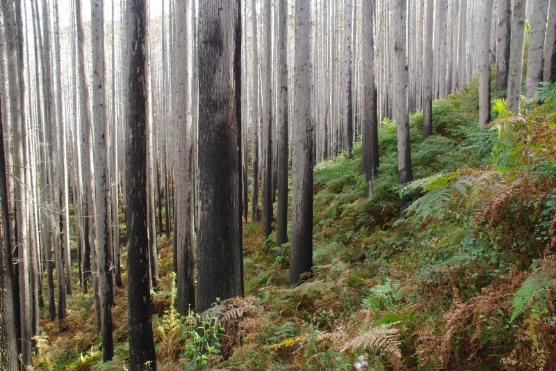 燃えた木々は葉を一つも付けることなく立ち続け足下に届くようになった日差しにより草が繁茂しています。