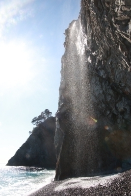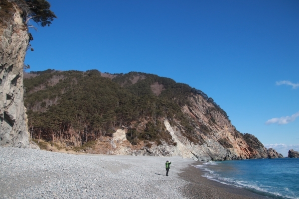 この日は晴天で、かつ10時4分が干潮で60cm、さらに、外海に面しているので普段は波が荒れることが多いのですが、春の海を連想させる穏やかな海という好条件が揃ったので、海岸にある滝を見に足を伸ばしてみました。こんな条件の良い日に巡り合うことは今までもなく、私も滝の下まで行くのは初めてでした。