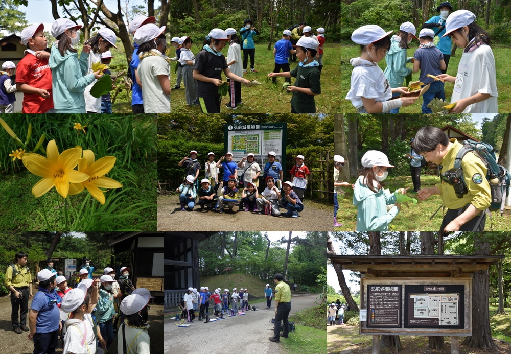 今日は、弘前公園内にある植物園が野外観察のフィールドです。ここには洋風、和風の庭園の他に、郷土の森の見本として各地から集められた樹木が植えられています。その一角に、白神山地コーナーがあります。西目屋の子供達は、身近に世界遺産がある恵まれた環境なのですが、3年生はまずここで、フィールドワークのお勉強をしてから、来年、本物の白神山地を歩くことになります。