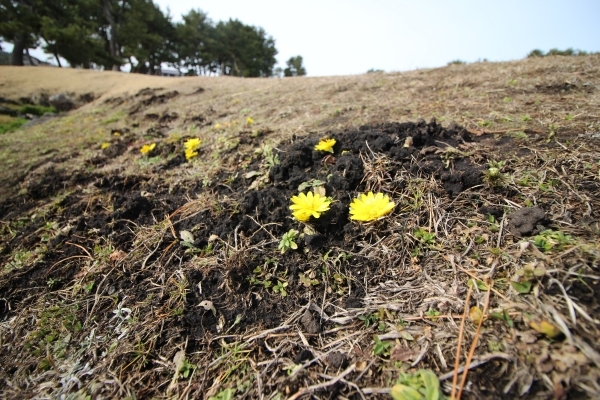 種差海岸天然芝生地ではぽこぽことフクジュソウが咲き始めております!