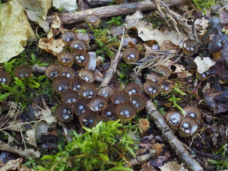 カップの中の白いつぶつぶは胞子の塊で、雨粒が中に落ちると、塊がはじけ飛ぶ仕組みになっています。