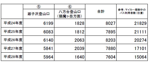 平成28年の利用者数は磐梯山が約2万4千人、雄国沼[登山道利用者]が約8千人、五色沼が約14万人、一切経山・鎌沼が約1万2千人でした。