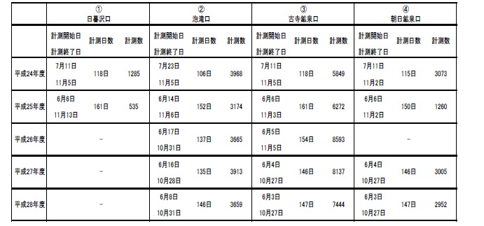 ※1 平成26年度の④朝日鉱泉口、平成26~28年度の①日暮沢口は、平成25年7月豪雨災害により登山口へのアクセス道が通行止めとなっていたため、計測を実施していません。