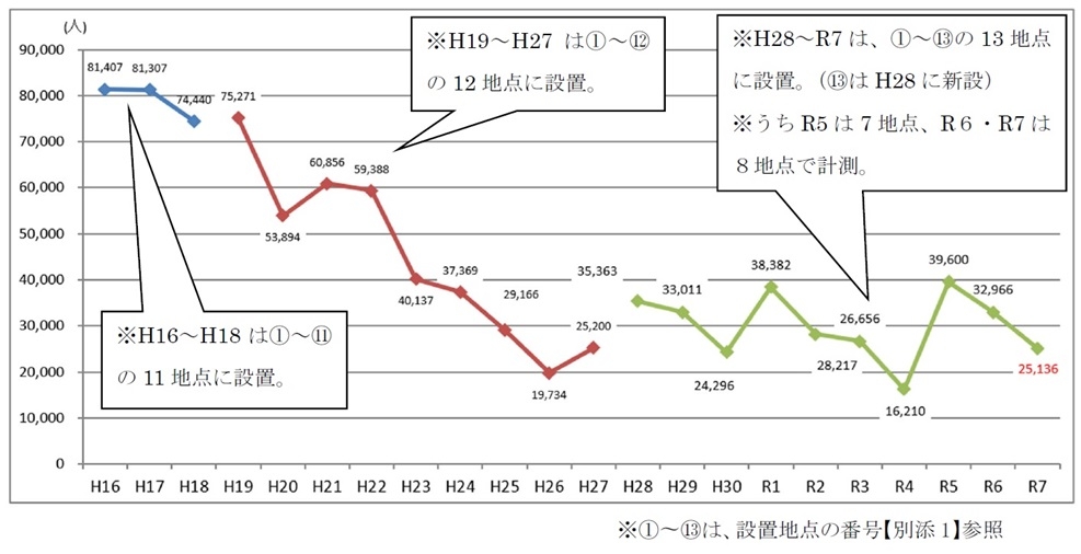 計測を実施した8地点における入山者数の合計は、25,136人となり、令和6年度と比較すると7,830人減少しました。(図1)参照