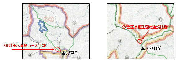 - ①以東岳直登コース(標高約1445m~1588m付近)