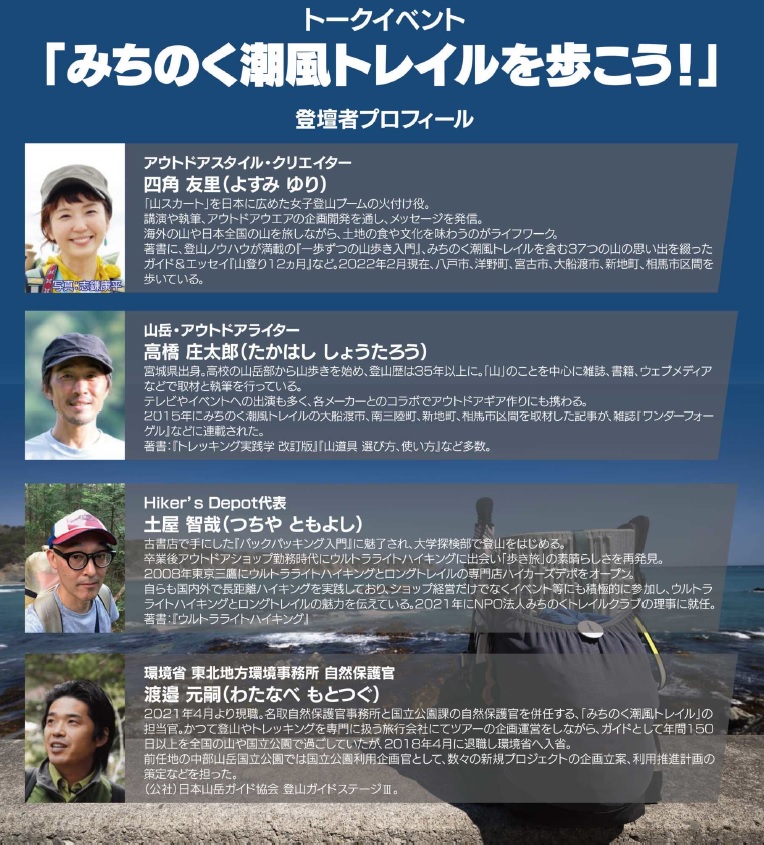 2月5日のトークイベント「みちのく潮風トレイルを歩こう!」は現地開催からオンライン配信に変更いたします。事前に参加申し込みをされていた方はもちろん、それ以外の方もご視聴いただくことができるようになります。オンラインを通して、皆さまにみちのく潮風トレイルの魅力をお届けいたしますので、ぜひご自宅などでゆっくりとご視聴くださいませ.