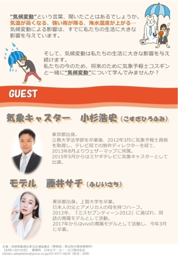 本セミナーでは、EMPOWER MIYAGI FES. produced by TGCのオープニングイベントにおいて、気象予報士の小杉浩史氏とモデル・タレントの藤井サチ氏との対談を通して、気候変動の影響への「適応」とは何かを学ぶとともに、宮城の気候・私たちのくらしはどう変わっていくのかを考えます。