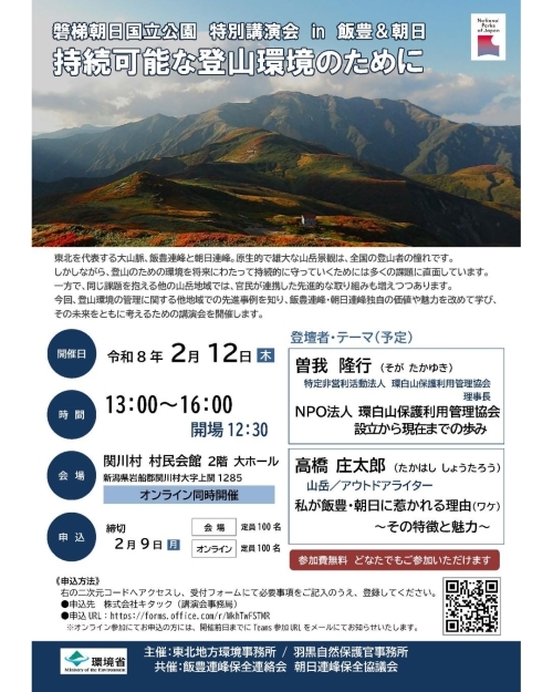 磐梯朝日国立公園 特別講演会 in 飯豊&朝日 ~持続可能な登山環境のために~ の開催について